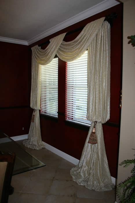 In our Top Treatment department we take pride and great care in the fabrication of all types and sizes of swag valances. We have the advantage of years of experience in swag construction and our expert consulting team will help you choose the correct lining or interlining that will enhance your fabric selection for proper drapability and beauty. From casual to dramatic or from pole swags to board mounted we have the expertise to turn your design into a true masterpiece. Whether it be an elaborate arch top swag valance or that hard to fit bay window, we will take your design and scale it to fit your window with your specifications.